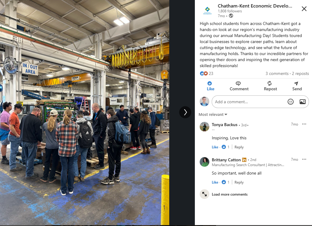 - Recognizing a gap between youth career aspirations and local industry opportunities, the Chatham-Kent Economic Development & Tourism team, in collaboration with manufacturers and educational institutions across the municipality, launched a strategic marketing initiative titled “Manufacturing Career Day.” This project was specifically designed to capture the imagination of high school students, parents, and educators while reinforcing the message that advanced manufacturing careers are accessible, innovative, and financially rewarding—right in their own backyard.