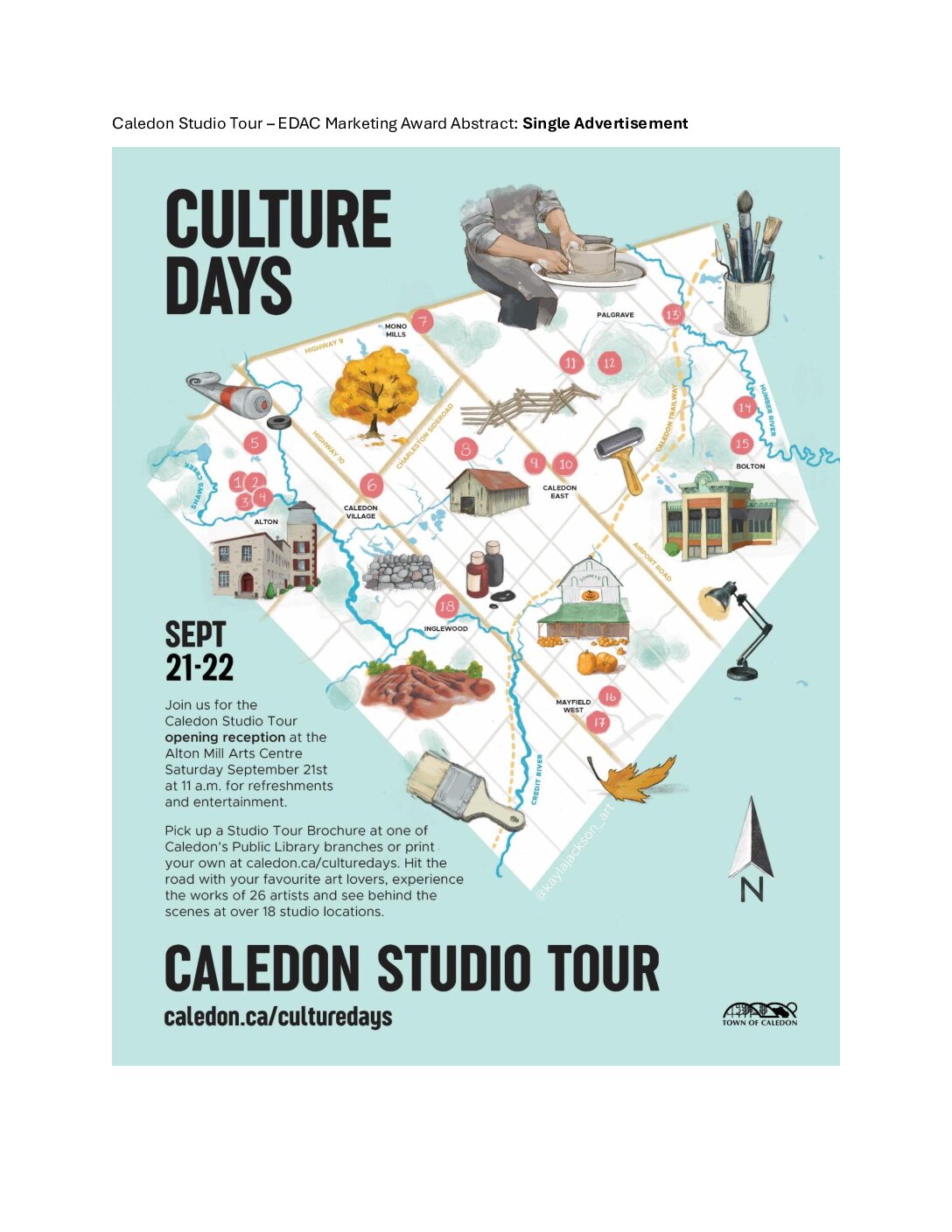 Caledon’s Tourism and Culture team launched the inaugural Studio Tour in 2024 as part of the Ontario Culture Days festival. Our submission is for the EDAC Single Advertisement award for our illustrated Caledon Studio Tour advertisement, published in In the Hills magazine. The project objective of the Caledon Studio Tour was to provide a unique and authentic tourism experience for visitors to Caledon, showcasing the region’s local arts and culture community by encouraging economic impact across the many villages and hamlets in the Town. The Studio Tour showcased 26 artists at over 18 stops across the Town of Caledon through a self-guided weekend-long tour. This event encouraged visitors to get up close and personal with the artist process, ask questions and purchase one-of-a-kind pieces of art directly from the artist. The challenges associated with the project included Caledon’s broad geographic area (spanning the size of Brampton and Mississauga combined) and the rural nature of many of our artist studios.