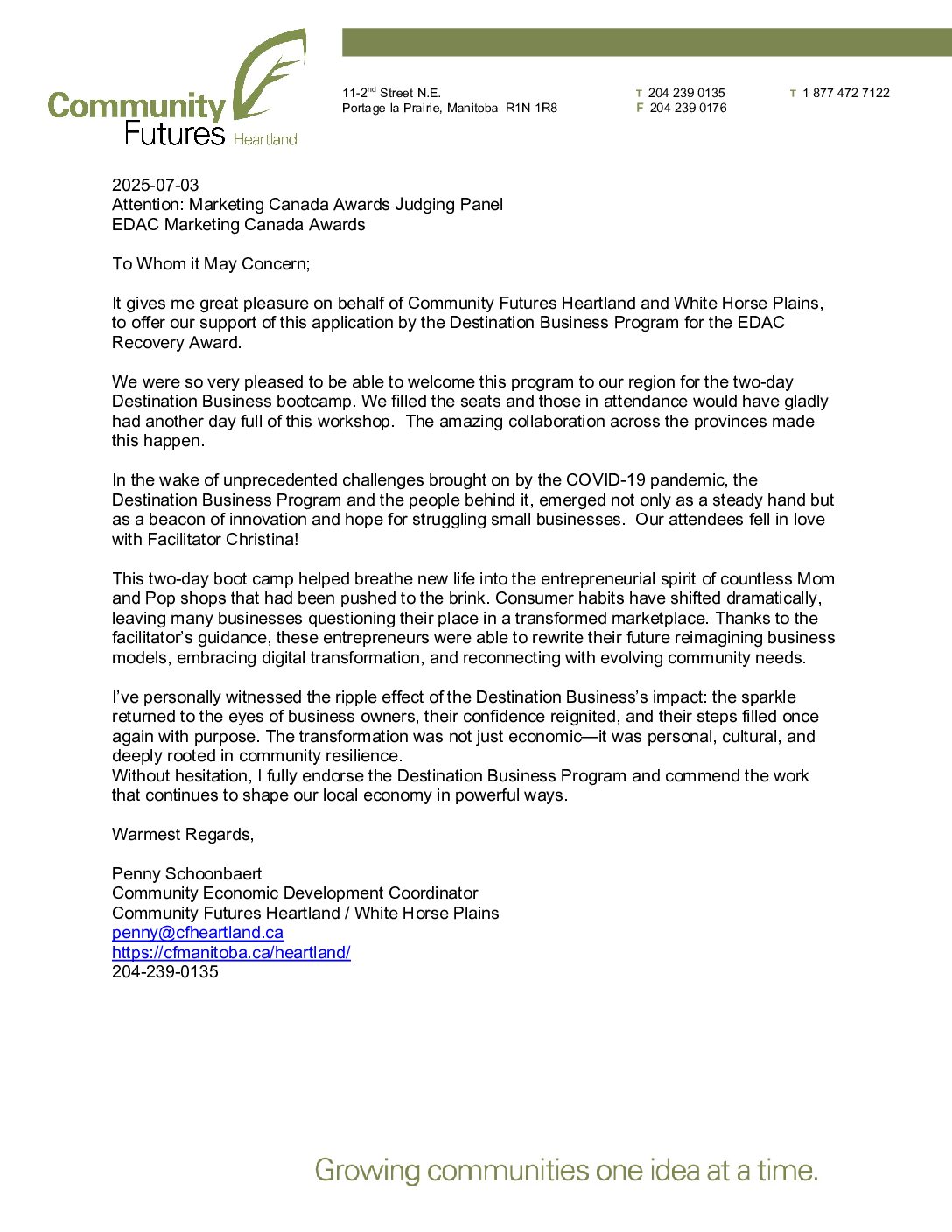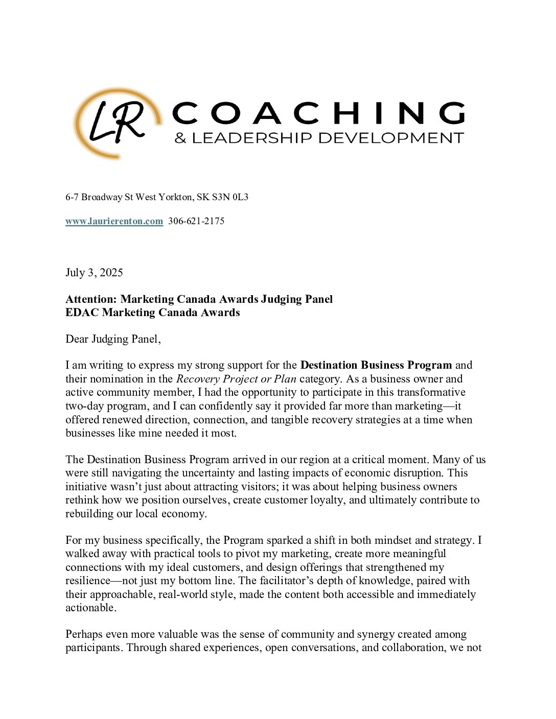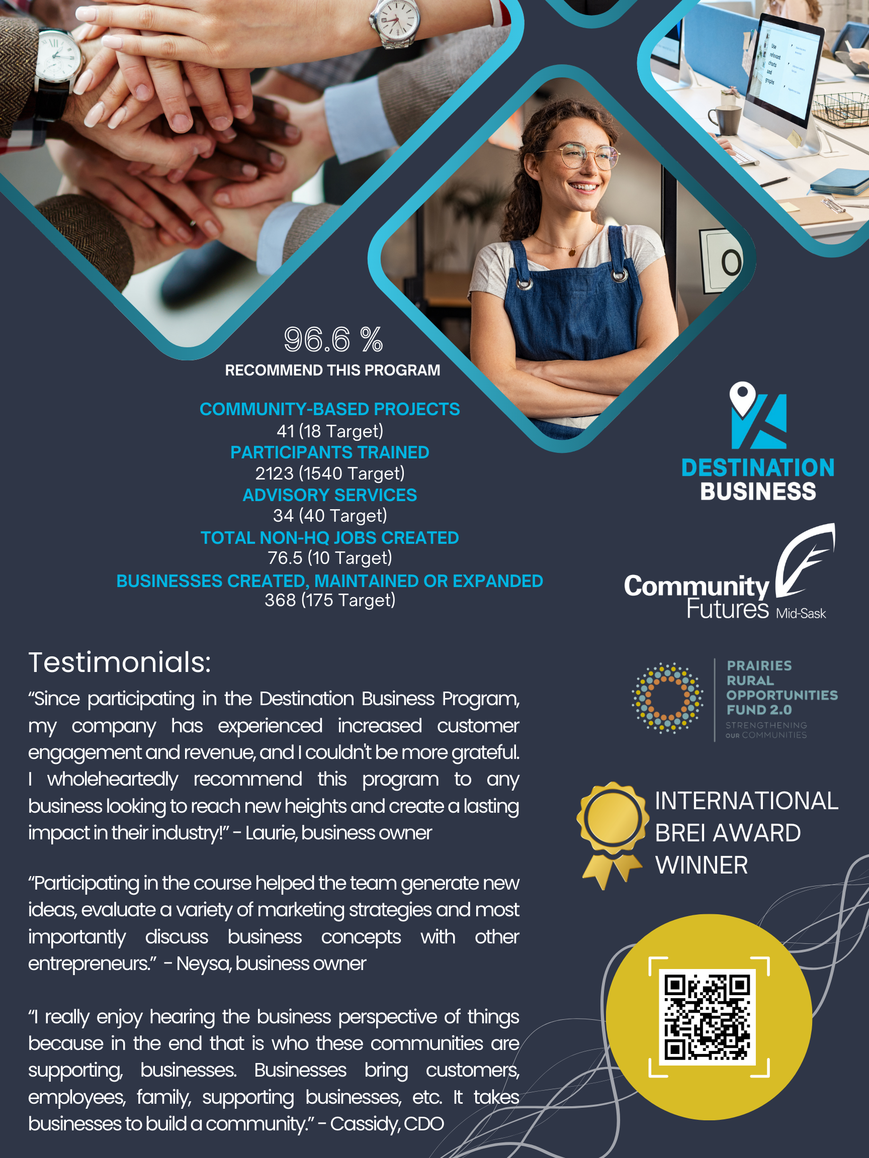In the aftermath of COVID-19, rural small businesses faced many disruptions such as the loss of revenue, changing customer behaviors, supply chain instability and staffing shortages. Recognizing the urgent need for economic recovery tools tailored to the unique needs of rural entrepreneurs, Community Futures Mid-Sask launched the Destination Business Program, a comprehensive initiative designed to build business resilience and attract external spending into local economies.