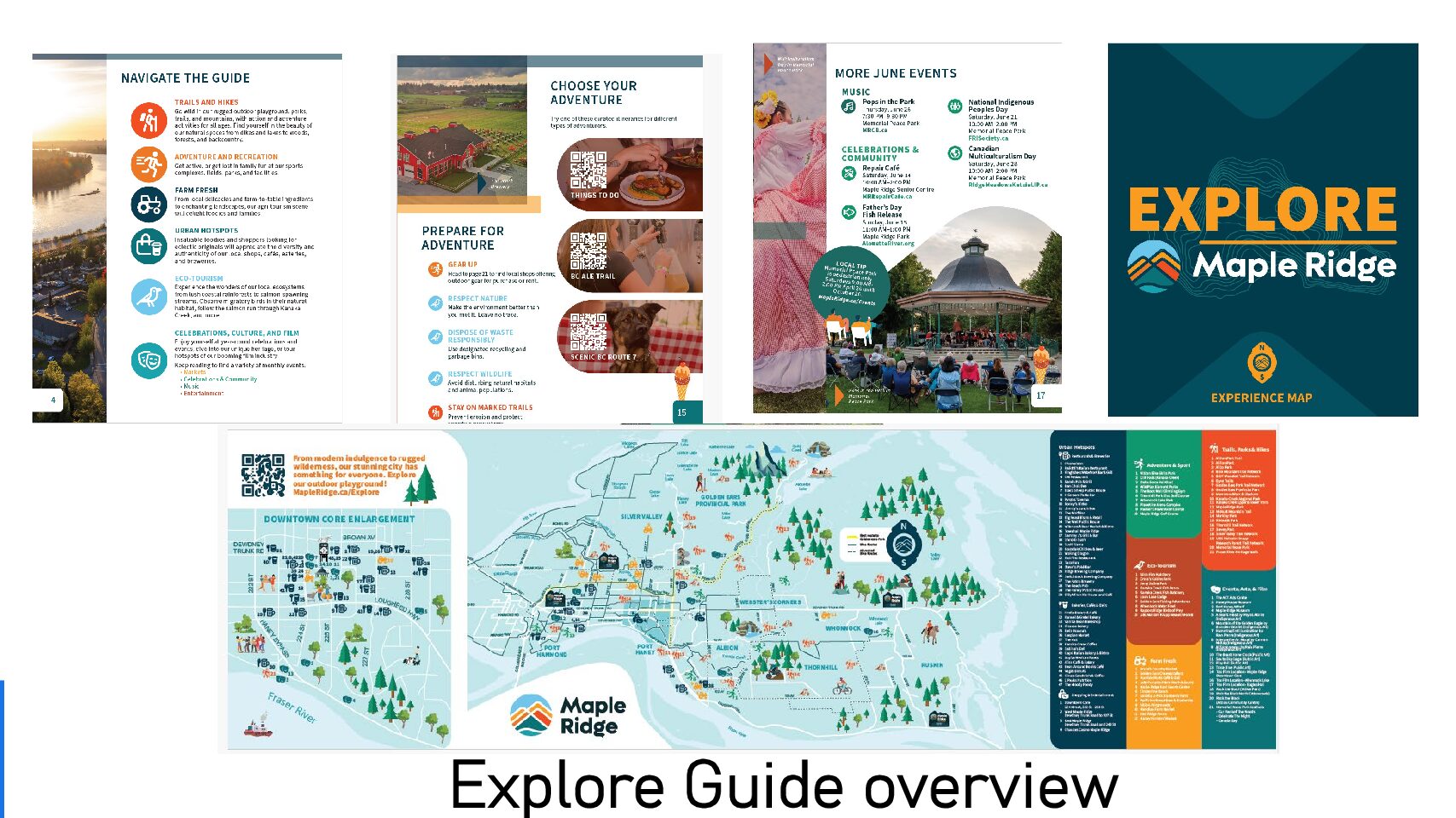 The Explore Maple Ridge Guide was developed as a unifying tourism and community-facing publication designed to consolidate the city’s seasonal activity guides, event calendars, and promotional materials into one streamlined, user-friendly piece. Its purpose was to offer residents and visitors a comprehensive, visually appealing, and easy-to-navigate resource showcasing events, attractions, parks, and tourism businesses across Maple Ridge. The guide was a response to a growing need for a harmonized approach to tourism and event marketing, enabling broader awareness while supporting the “One City” campaign.
