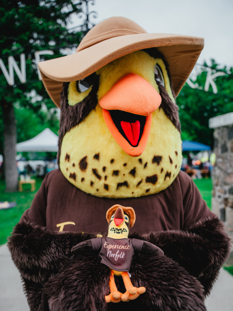 In 2025, Norfolk County Economic Development continues to spotlight Scout—a joyful, engaging, and versatile mascot that has become a symbol of the County’s identity, values, and vision. Introduced in 2024, Scout was inspired by the Canada Warbler, a native species representing Norfolk’s biodiversity and spirit of exploration. Initially launched as a small digital character, Scout has grown into a versatile tool for tourism marketing and economic development outreach, and more recently, in business retention and expansion (BR&E) efforts.