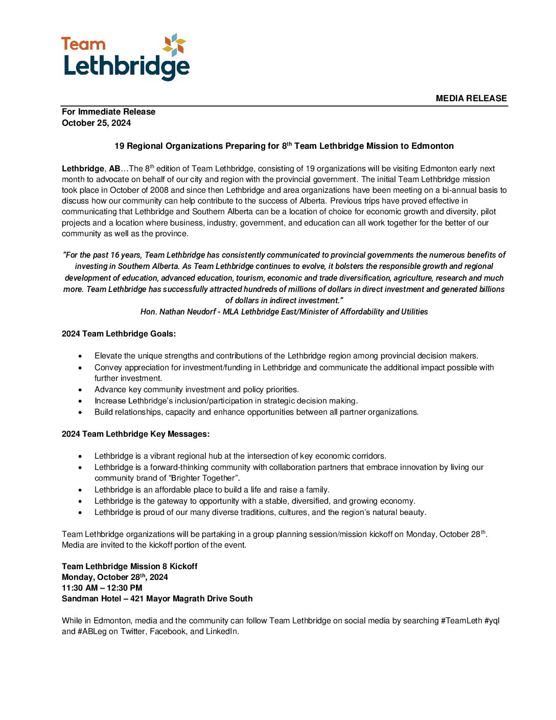 Team Lethbridge is an advocacy initiative organized by Economic Development Lethbridge where organizations in Lethbridge travel to Edmonton every two years to meet and discuss the benefits of Lethbridge with the provincial government. The 8th mission was held in November of 2024 and 50 community leaders from 19 local and regional organizations took part in the 3-day trip to the Alberta Legislature.