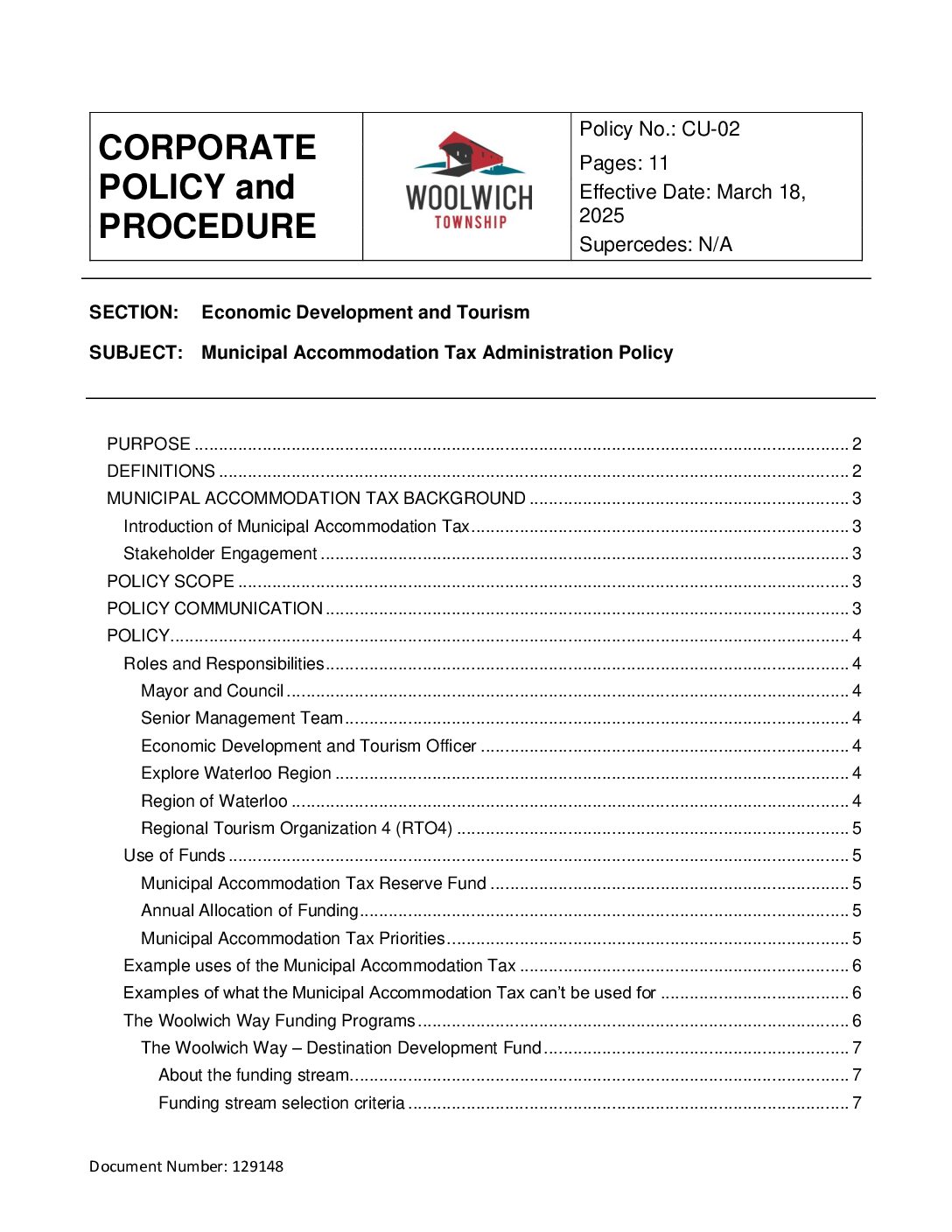 The Municipal Accommodation Tax (MAT) Administration Policy represents the Township of Woolwich’s proactive approach to sustainable tourism development, economic diversification, and community well-being. This publication serves as a strategic and operational guide for managing MAT revenues in alignment with municipal, regional, and industry goals. Prior to the policy being developed, the responsibility was placed on Council to make decisions on how MAT funds were redistributed based on staff recommendations.